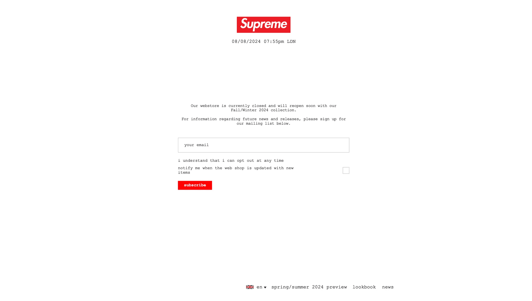 Supreme often closes its site between drops, driving traffic to a sign-up form where fans can register for updates and exclusive early access.